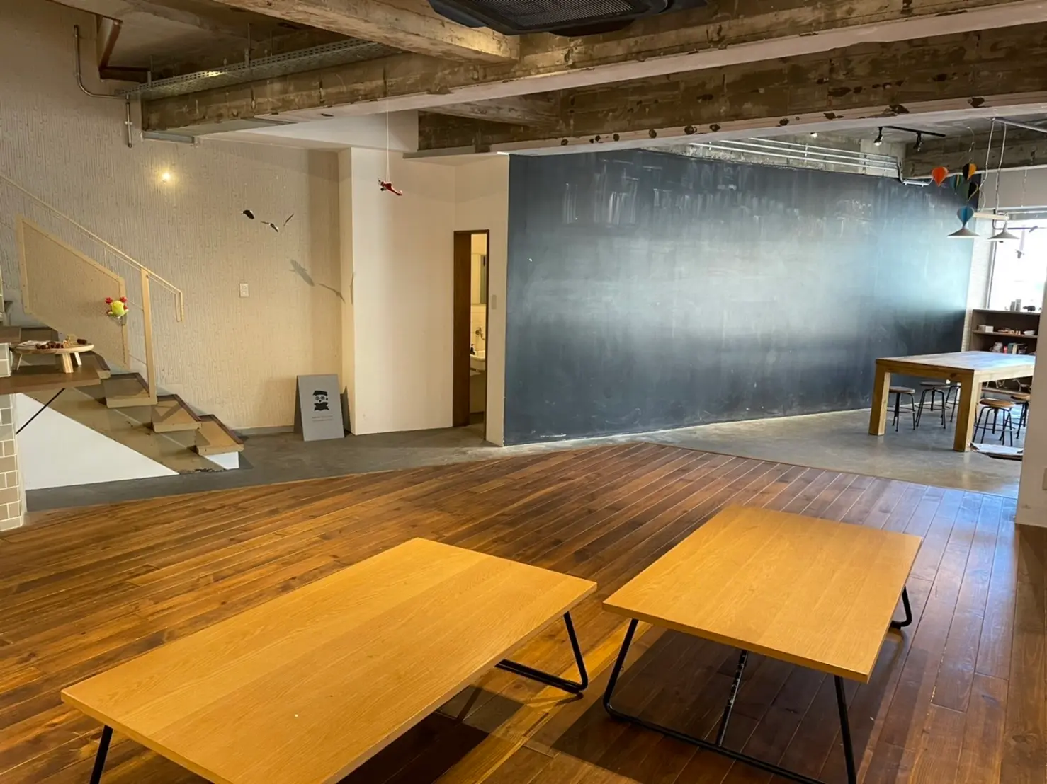 大和西大寺駅から徒歩4分のOWL レンタルスペースは、古いビルをリノベーションした温かみのある空間が魅力です。やわらかい雰囲気のインテリアで、パーティーやワークショップ、展示会など多目的に利用できます。1階に位置しているためベビーカーでの入室がしやすく、壁一面の黒板は子どもたちが自由にお絵描きを楽しめる設計です。